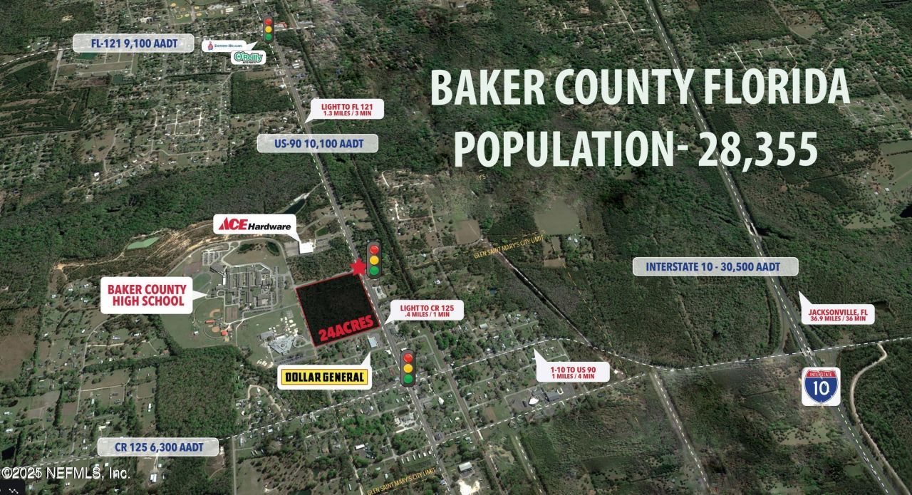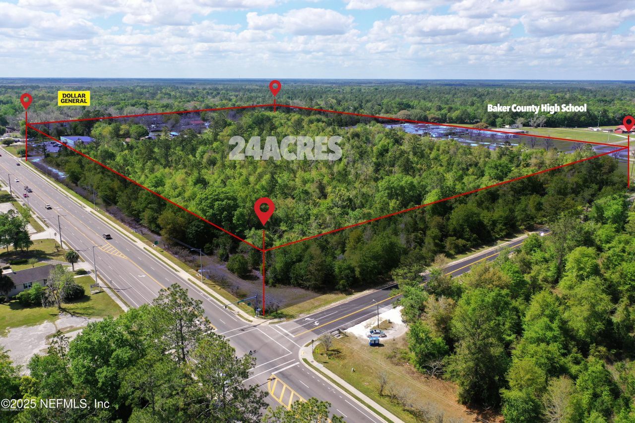 Vacant commercial property in the town of Glen St. Mary. Property features mature trees on 24 acres! Plenty of land to build future businesses. Unrestricted uses include: motels/hotels, restaurants, gift shops, regional shopping centers, retail sales and service establishments, general office, and much more! Seller makes no guarantees on water and sewer capacities. Property is within a mile of I-10. Property is part of parcel #362S21005100590010. Separate listing for other part of parcel (MLS #2048496). **ALL PARCEL BOUNDARIES ARE ESTIMATED ONLY**
