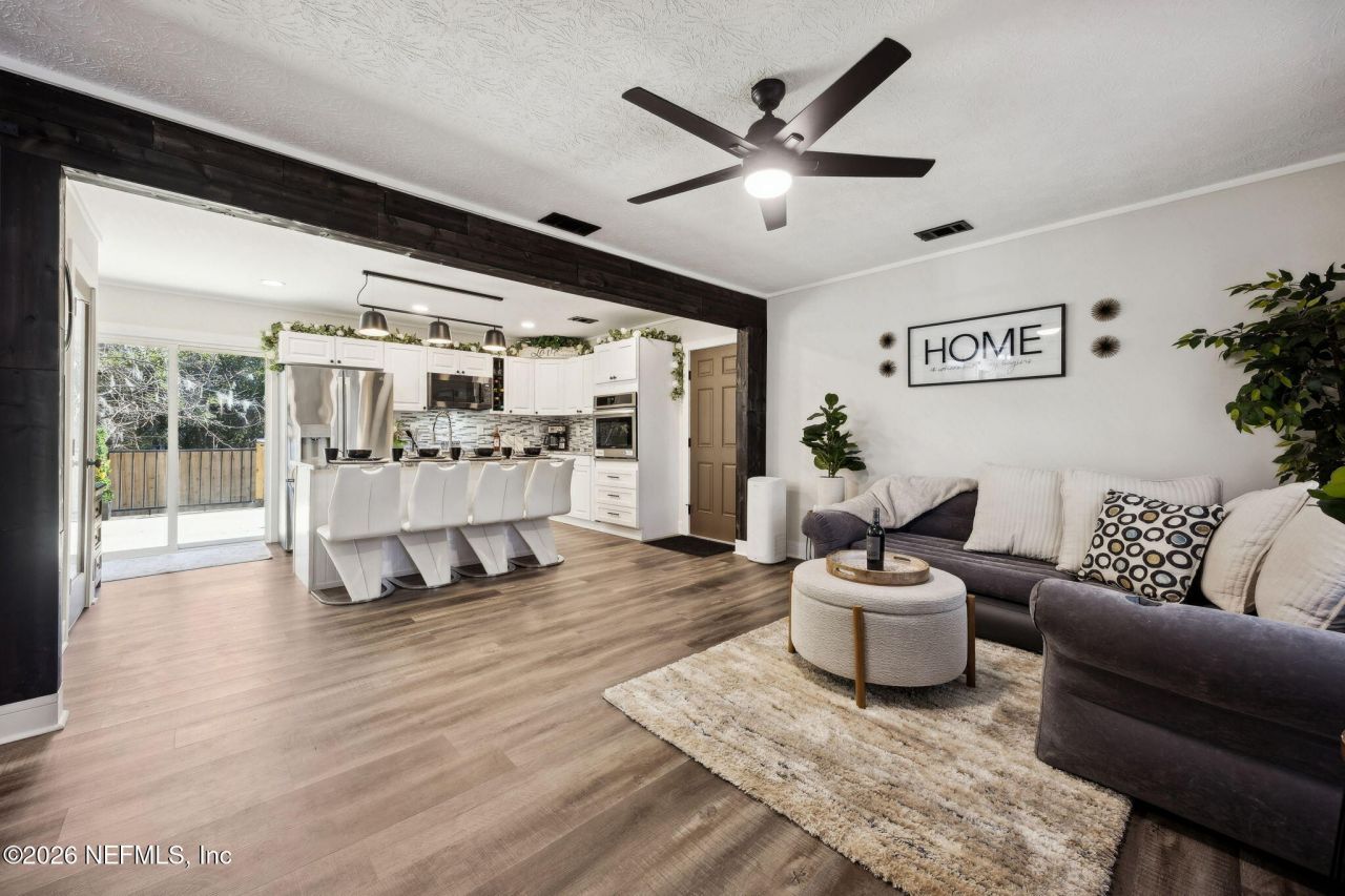 Welcome to this stunning, fully remodeled bungalow ideally located less than two miles from both the pristine beaches of Amelia Island and the charming Historic Fernandina Beach district. This move-in-ready home blends modern updates with coastal comfort on a spacious lot just under a quarter acre. Every detail has been thoughtfully upgraded, including a brand-new roof with gutters/downspouts, new doors throughout, new ceiling fans, new water heater and water softener and durable vinyl plank flooring with stylish tile in the bathrooms. The completely redesigned kitchen shines with new cabinetry, stainless steel appliances, walk-in pantry and a new washer/dryer set. Both bathrooms have been fully renovated with new fixtures and finishes. Step outside to enjoy a newly fenced backyard-perfect for entertaining, pets, or relaxing-and a brand-new rear deck ideal for outdoor living. Additional features include a one-car garage and ample yard space with endless possibilities. Whether you're looking for a primary residence, beach getaway, or investment opportunity, this truly move-in ready and updated Amelia Island home offers the perfect combination of location, style, and convenience with NO HOA or CDD fees!