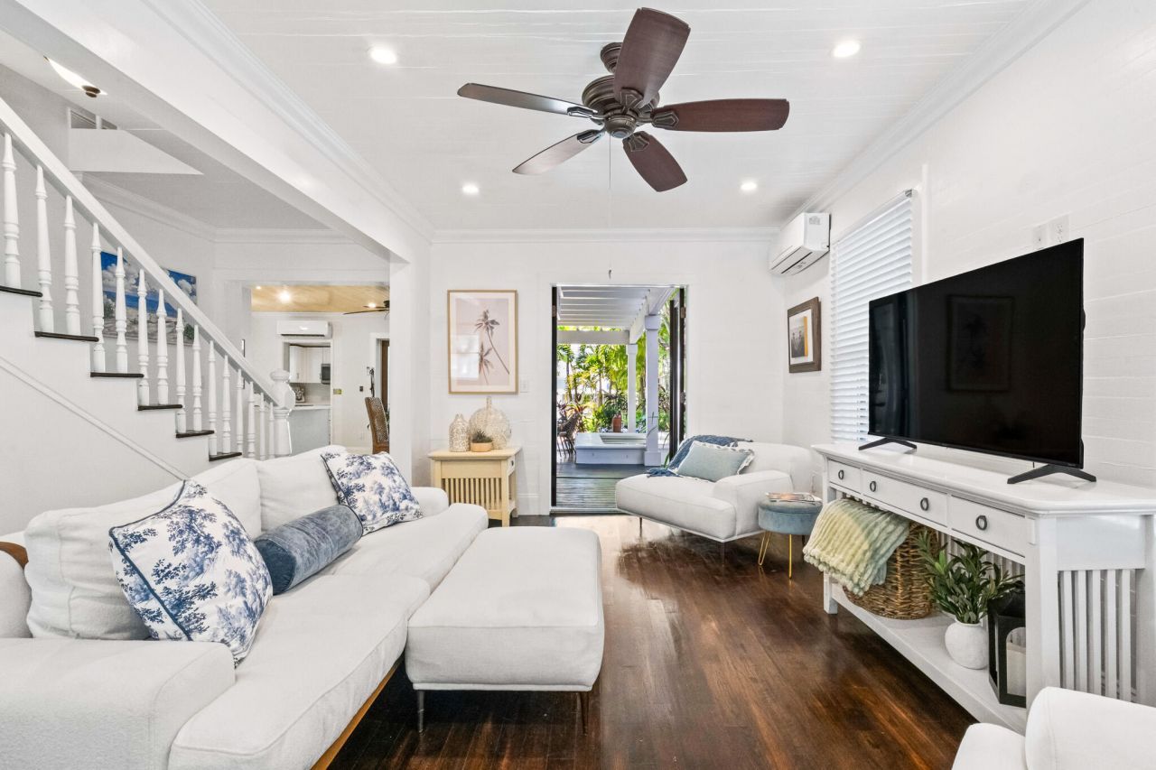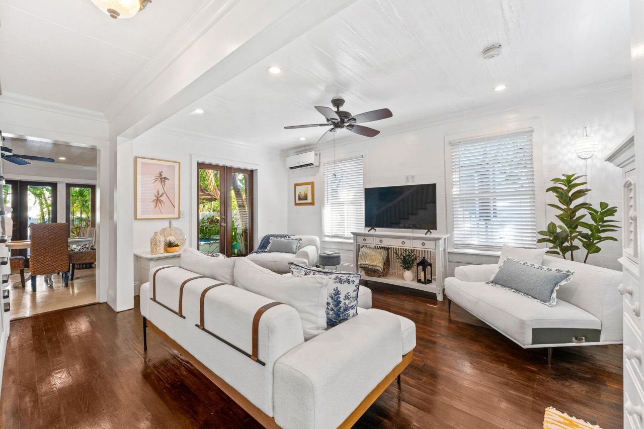 Tucked within the charm of Old Town Key West, this fully renovated historic Eyebrow home invites a lifestyle shaped by tropical surroundings, outdoor living, and close proximity to the island's most recognized destinations. Set on a deep 4200+ square foot lot stretching from Eaton Street to Thompson Lane, the property offers 3 bedrooms and 2 baths in a setting designed for both everyday living and relaxed entertaining.Recognized as a 2016 Preservation Award Winner, this lovely home reflects thoughtful preservation of its architectural style while incorporating modern updates including a metal roof and a comprehensive renovation. Inside, hardwood flooring, a light-filled living area, and a main-level primary bedroom create a comfortable and functional layout. The open design flows naturally to the outdoor spaces, while the updated kitchen features white cabinetry, quartz countertops, stainless steel appliances, tile backsplash, and dedicated prep space, along with additional storage and an interior laundry area. French doors extend the living space outward to a covered deck and courtyard.The outdoor setting is a defining element of the home, centered around a private heated pool, covered lounge area and outdoor bath. Gorgeous palms and lush plantings frame the backyard, creating a private garden atmosphere with brick walkways and a spacious courtyard for dining and gathering, while string lighting enhances the space for evening ambiance.The deep lot includes off-street parking with a brick-paved driveway accessed from Thompson Lane, a valuable feature in Old Town. Just moments from the Historic Seaport, Duval Street, and some of Key West's most loved local spots, this location provides convenient access to dining, shopping, and live entertainment.With its combination of location, updates, outdoor living spaces, and off-street parking, this property presents a compelling opportunity for use as a primary residence or vacation home in Old Town Key West..