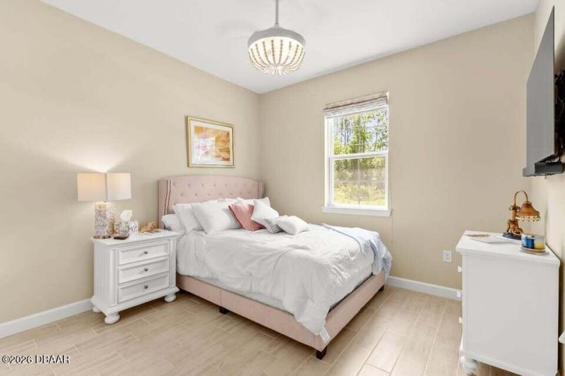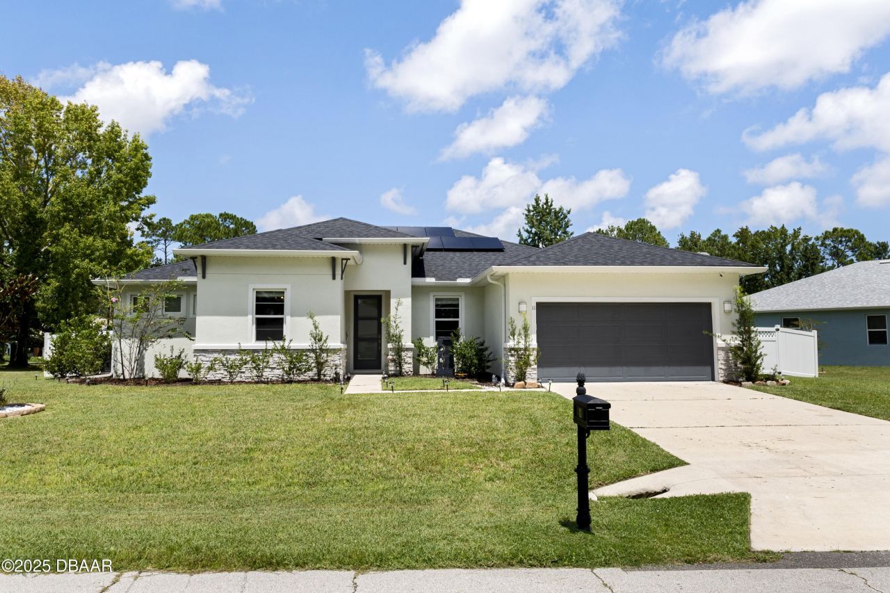 Welcome to this stunning 2022 Palm Coast residence, a move-in ready, solar-powered home that perfectly blends modern design, energy efficiency, and luxurious upgrades. From the moment you step inside, you'll be captivated by the open, light-filled layout with elegant wood-look porcelain tile flooring, canned lights on dimmers, and surround sound by Definitive Technology in the living area, creating the perfect setting for everyday living and entertaining. The heart of the home is the beautifully designed kitchen, showcasing quartz countertops, a spacious center island, subway tile backsplash, 42-inch shaker cabinets, stainless steel appliances, including a refrigerator that makes craft ice, and a Kinetico water filtration system. The kitchen flows seamlessly into the expansive living area and out through sliding glass doors to the extended lanai with pavers. Complete with a covered grill area and Alexa-commanded bar lights, this space is designed for unforgettable gatherings. The fully fenced backyard with white vinyl fencing and gate offers privacy and plenty of room to enjoy the outdoors. The oversized primary suite is a private retreat with a tray ceiling, a spa-inspired bathroom featuring dual quartz vanities and a walk-in shower, and a custom walk-in closet with built-ins. A private guest suite with its own bathroom provides comfort for visitors, while additional bedrooms offer generous space and double-door closets. An office/flex room adds versatility to fit your lifestyle needs. Smart home technology is found throughout, with Google smart features for convenience and energy-efficient Low-E double-pane windows that bring in natural light while helping reduce utility costs. The home also includes an indoor laundry room with quartz counters, shaker cabinets, sink, and washer and dryer. Set in the desirable Palm Coast area, just minutes from beaches, parks, shopping, and dining, this home delivers the perfect combination of luxury, comfort, and sustainability. Whether you're looking for a stylish retreat, a family-friendly haven, or an eco-conscious lifestyle, this home checks every box. All information deemed accurate but cannot be guaranteed.