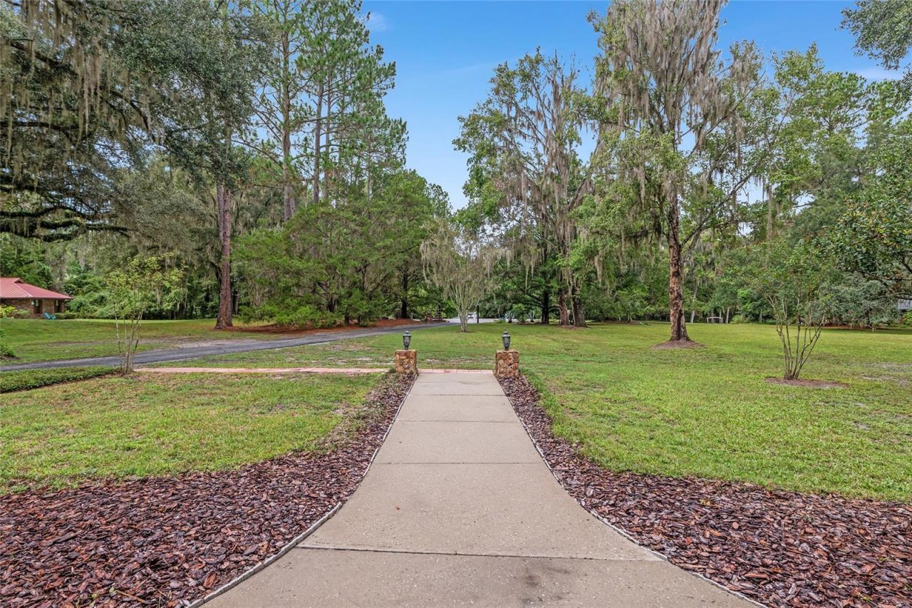3.3 + Private Acres 4 Bedrooms 3 Bathrooms 2,524 SFStep off the quiet cul-de-sac and into this hidden gem nestled on 3.3 acres of mature oaks and natural Florida beauty. This home blends rustic warmth with modern possibility.As you arrive, the deep-set yard and lush tree canopy give you a sense of retreat. A bright red front door draws you in, flanked by board-and-batten siding and tasteful landscaping that hints at the character inside.The heart of the home opens in dramatic fashion. Vaulted ceilings soar above the great room, anchored by a stone-faced fireplace and a wall of windows that frame your woodland view. Rich hardwood floors flow underfoot, connecting living, dining, and gathering zones with an organic ease.The kitchen is cozy but efficient, with a view out the windows, good counter space, and the feel of a home that's meant to be lived in (not just staged). Nearby, a built-in pass-through or serving window with shelving gives this space flexibility-perfect for entertaining or simple daily flow.Four well-proportioned bedrooms, along with three full baths, include a distinct in-law suite with its own private entrance. That makes this property ideal for multi-gen living, guest privacy, or even a rental segment. Two separate entrances bolster flexibility.Out back, an oversized deck invites you to linger-morning coffee, evening grill, quiet star-gazing. The property also includes RV hookups. The roof was replaced in June 2023, which gives peace of mind for years to come.Utilities are on well and septic, and there's no HOA to limit your vision.