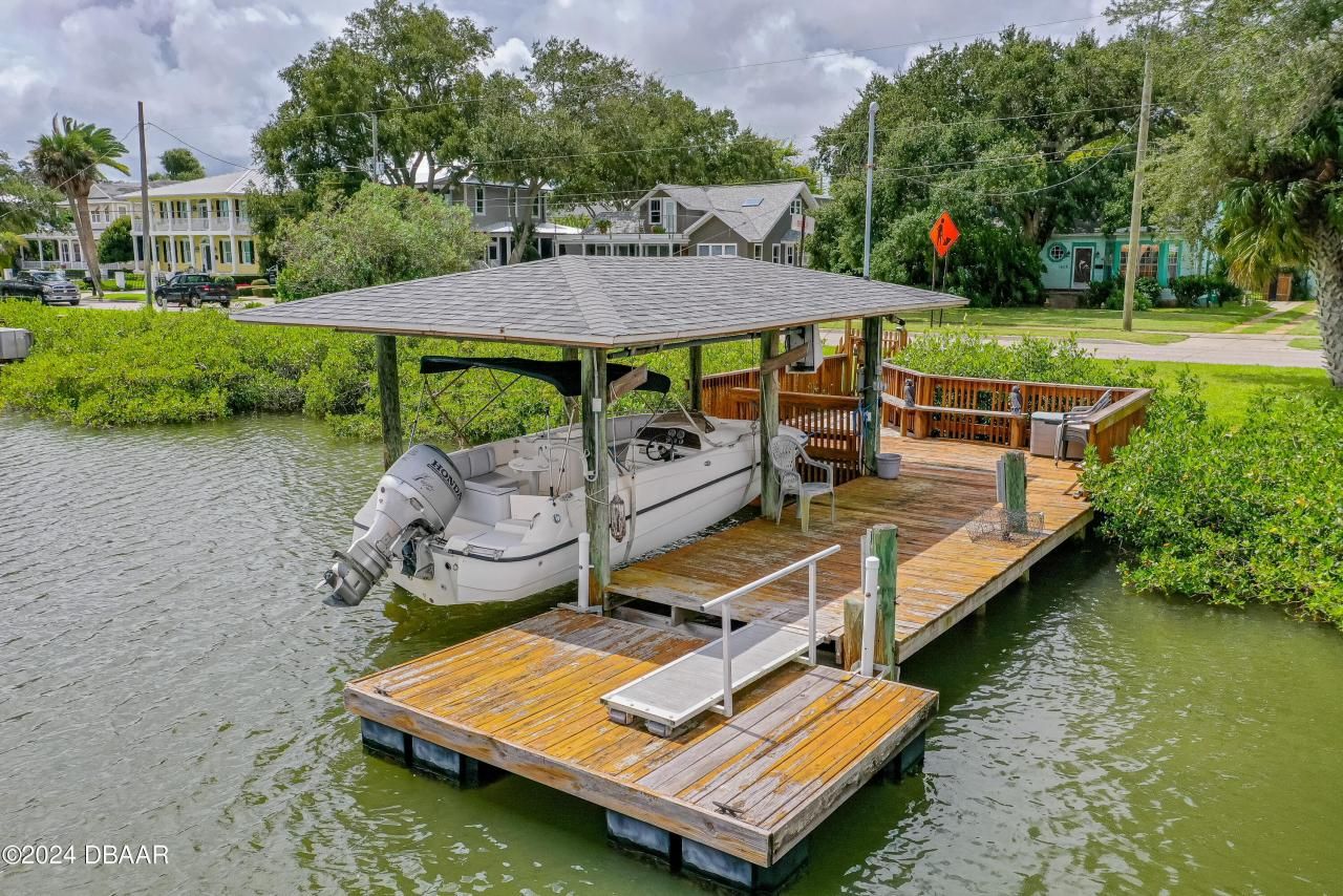 Nestled on one of the largest parcels in the area, this charming 2-story, 3-bedroom, 2-bath home on Riverside Drive offers the perfect blend of charm, space, and waterfront living with stunning views. Just blocks from the historic, vibrant downtown New Smyrna Beach with its charming boutiques and exquisite dining, this property provides both tranquility and easy access to the best the area has to offer, including the Smyrna Yacht Club and the beautiful nearby beaches. The home boasts breathtaking views and direct access to the Intracoastal Waterway, complete with riparian rights that allow you to securely store your watercraft on your private dock with a boatlift. Whether you're an avid boater or simply love being near the water, this home offers unparalleled convenience and recreational possibilities. Original wood floors create a warm, inviting atmosphere, and the spacious kitchen flows seamlessly into the dining room, making it perfect for hosting family gatherings. The cozy living room, featuring a wood-burning fireplace, overlooks the waterway, creating the perfect spot to unwind and watch the world go by. The split-bedroom floorplan offers privacy and comfort, with a large den and sitting room that can easily accommodate overnight guests. Enjoy peaceful sunrises from the front porch or your private dock, while the expansive rear deck, shaded by mature trees, provides an ideal setting for evening sunsets and outdoor relaxation. The second-story bedroom includes a private deck, perfect for enjoying your morning coffee while soaking in the views. A detached garage provides ample space for storage, along with an additional area for garden tools and recreational equipment. The waterfront portion of the property is well-equipped, featuring a dock, boatlift, floating platform, and its own 100-amp power service and water well, making it ready for all your boating needs. This home offers plenty of space for future expansion, whether you're looking to add on to the existing structure or build your dream home on this oversized parcel. Located just minutes from boat ramps, beaches, and several golf courses, and a short drive to Flagler Avenue and Canal Street, where local shopping and top-rated dining await, this Riverside Drive home provides the perfect balance of serene waterfront living and lively coastal activities. Don't miss this rare opportunity.