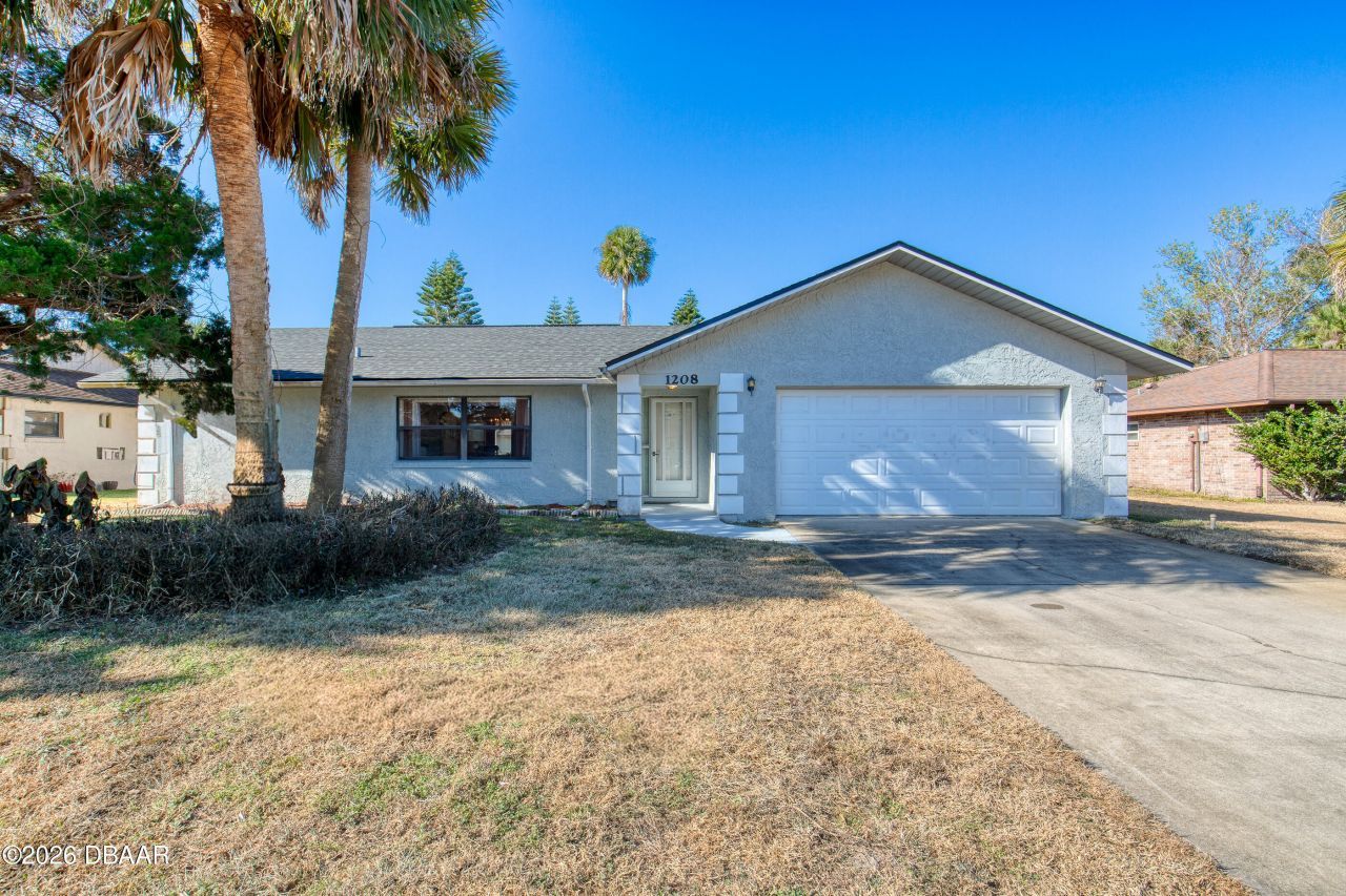 BRAND NEW ROOF on the amazing home at 1208 Mardrake Road in Daytona Beach, nestled in the desirable Fairway Estates neighborhood. This charming home features three spacious bedrooms, 2 bathrooms and a 2 car garage. As you walk in, you are greeted by a welcoming foyer. To the left is the great room, perfect for entertaining or relaxing. Straight ahead, you'll find the kitchen and living room, both of which are open and inviting. The living room and dining room each have glass sliding doors that lead out to the patio, allowing for easy indoor-outdoor living. The home features a split floor plan, providing additional privacy for the master suite. The master bedroom includes an en-suite bathroom for added convenience and privacy. Each bedroom has large closets for ample storage.Located just a short drive from the beach, this home offers the perfect blend of comfort and coastal living.