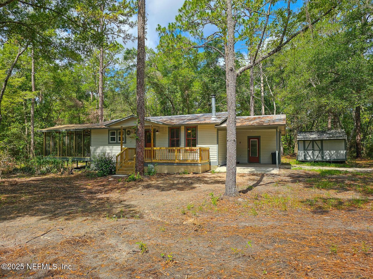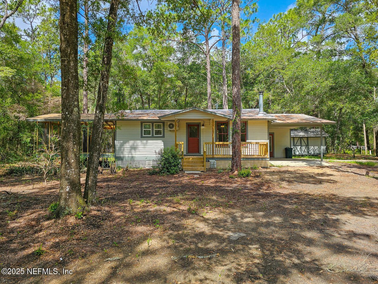 Charming 1940's Remodeled Historic Bungalow with Modern Touches & Screened Porch Retreat! Discover the timeless charm and modern comforts of this beautifully remodeled 1940's historic bungalow, relocated to its current location in 1970. This inviting residence blends vintage character with modern updates, offering a cozy yet stylish living space perfect for those who appreciate history with modern convenience. Inside you will be greeted by stunning original hardwood floors that have been meticulously refinished, adding warmth throughout. The home features a fully functional original wood-burning stove. The remodeled kitchen boasts modern appliances and finishes complimenting the ample storage in cherry cabinets, new butcher block acacia and cherry countertops. The newly renovated bathroom showcases a large luxurious walk-in shower and double vanity. Step outside to the expansive 26x26 covered newly screened enclosed side porch, covered with a durable fiberglass roof. Located off the kitchen and one of the bedrooms, it is a perfect outdoor sanctuary for relaxing evenings, entertaining guests, or enjoying your morning coffee. The property boast two bedrooms with deep closets and individually controlled mini-split air conditioning units. A new front porch and deck, freshly painted inside and out. This residence sits on a half-acre plus lot, offering plenty of outdoor space for gardening, recreation, or future expansion. Your next home also features an attached laundry room and carport, plus an outdoor shed for additional storage. Not to mention it is a five minute drive to historic Melrose. Florida. Schedule a viewing today and experience the perfect harmony of indoor and outdoor living.