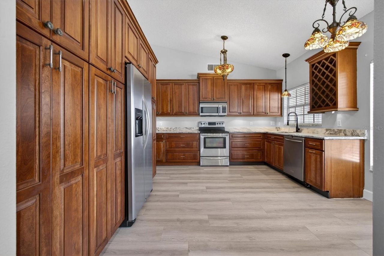 Welcome to this beautifully renovated high ceilings 3-bedroom, 2-bathroom home features a sparkling private pool with custom natural stone waterfall and gorgeous in-ground spa, a spacious 2-car garage, and eco-friendly solar panels with a gas-powered AC unit. (Solar panels are fully paid off)Enjoy peace of mind with no rear neighbors, giving a breathtaking scenic view. Additionally, home has a brand-new roof with 30-year architectural shingle life. Home offers new exotic granite countertop, custom solid wooden cabinet, stainless steel appliances. Beautifully renovated bathrooms featuring modern fixtures like vanities, mirrors, and shower accessories. Has new luxurious vinyl floors in the entire living area. Ideally located just minutes from downtown Clermont and US Highway 50 (West Colonial Drive), this home offers the perfect blend of comfort, style, and convenience. Clermont is rapidly growing, with new stores, amenities, and infrastructure enhancing the community, making it one of the most sought-after areas in the region.
