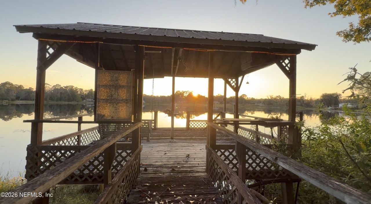 Fishing is a fantastic experience here! Immerse yourself in the tranquil waters of this delightful property right on Lake Rocky. This serene spot is great for swimming and fishing enthusiasts. Take advantage of boat trips on the three interconnected lakes and enjoy stunning sunrises over Lake Jewel from your living room, as well as sunsets from your back porch overlooking Lake Rocky. For those craving more extensive boating, the canal leads to Lake Faye, offering further fishing opportunities. The spacious home includes both a living room and a family room with a cozy fireplace, great for entertaining. Outdoors, find a covered dock with a fish cleaning sink, lush landscaping featuring mature fruit trees, and a large lakeside deck, all nestled on a peaceful dead-end street. Approaching Jewel Avenue will lift your spirits as you prepare to create lasting memories!
