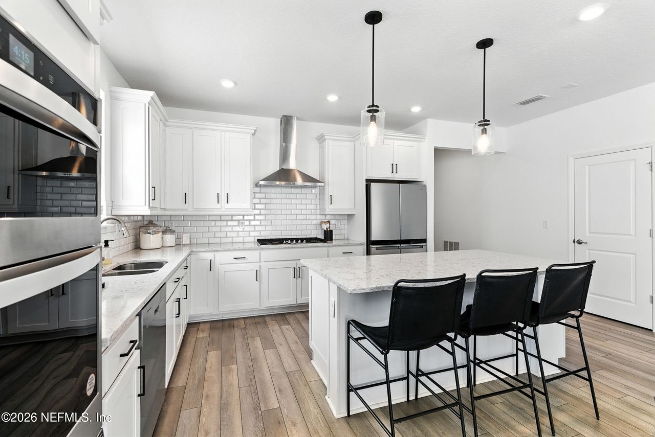 Like-new 4BR/2BA home built in 2023 in sought-after Grand Oaks! Open floor plan with LVP in main areas and carpet in bedrooms. Upgraded kitchen features white shaker cabinets, quartz island, subway tile backsplash, gas range, and stainless hood.Enhanced laundry with added cabinetry, shelving, and drying rack. Spacious primary suite with walk-in closet and walk-in shower with bench.Enjoy a covered lanai, fully fenced yard, and extended paver driveway. Located in top-rated St. Johns County schools with resort-style amenities--pool, splash park, fitness center, playground, and tennis courts.