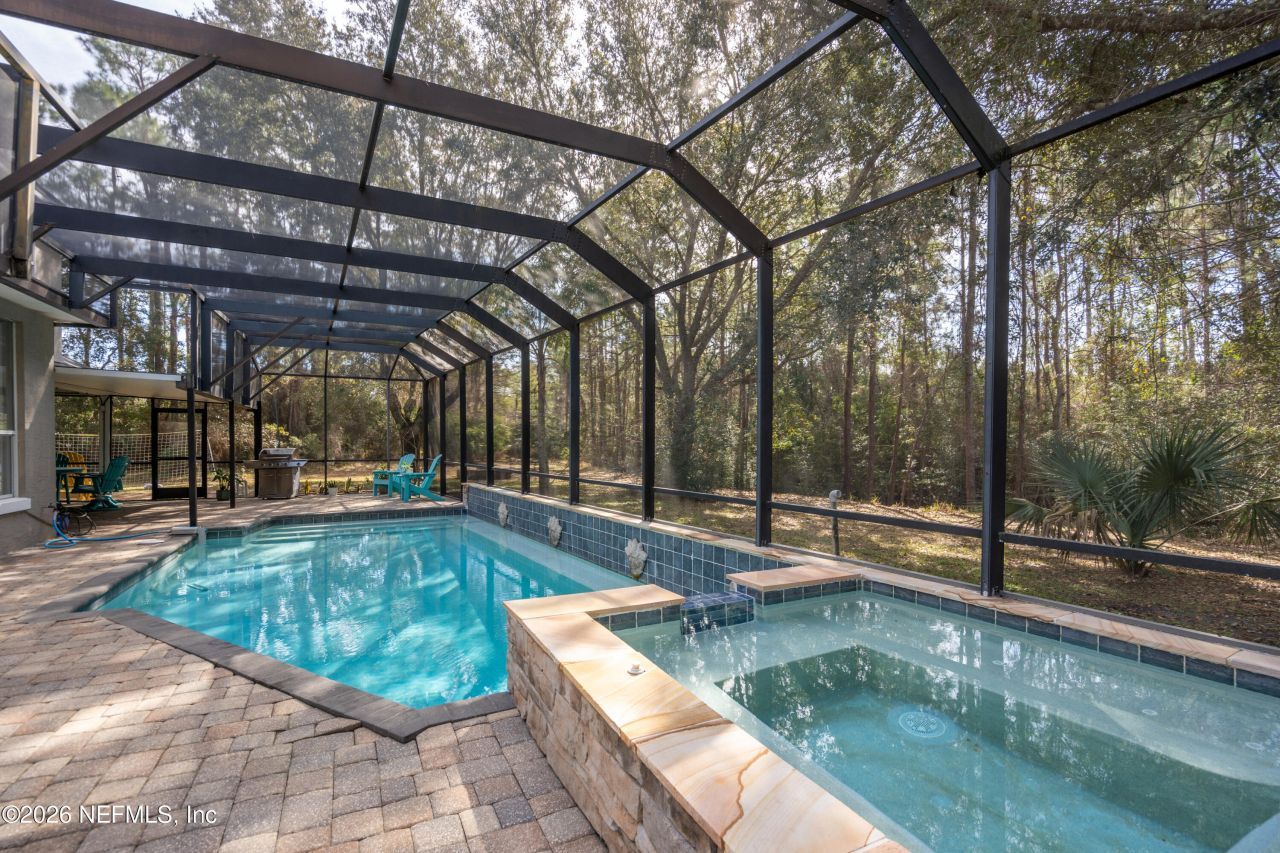 Beautifully maintained 4-bedroom, 3-bath home offering just over 2,900 sq ft in the established Tuscany neighborhood within the St. Augustine Shores community. Enjoy Florida living with a private backyard retreat featuring a large pool with hot tub and an expansive screened enclosure with plenty of space for outdoor dining and entertaining. Interior highlights include updated LVP flooring, a cozy fireplace with custom built-ins, and a spacious primary suite with en-suite bath and large walk-in closet. Two additional main-level bedrooms share a generous guest bath, while an upstairs bedroom with full bath provides ideal guest or flex space. The converted garage offers excellent storage with shelving and is perfect for a workout room or playroom. Conveniently located near Hartley Elementary and only a 15 minute drive to the beaches, 15 minutes to downtown St. Augustine!