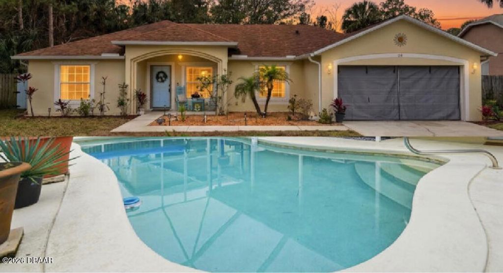 4 bedroom, Immaculate block pool home situated in a peaceful neighborhood offers a perfect blend of comfort and convenience. Upon entering, you're greeted by a spacious open floor plan consisting of both a family room and a separate living room. The open kitchen features a butcher block island for prepping meals or gathering. Whirlpool stainless steel appliances, and ample cabinet space.The Primary suite provides a serene retreat with a walk-in closet and an en-suite bathroom equipped with dual sinks, new stone countertops and faucets, a soaking tub, and a separate shower. Three additional bedrooms, full bath and inside laundry room giving flexibility for family, guests, or a home office. Enjoy peace of mind with recent big ticket items complete. Roof 2020, Hot water heater 2022 and A/C 2023Step outside to your private oasis"an inviting pool surrounded by a screened lanai for relaxing & enjoying outdoor dining & gatherings. Outdoor shower to rinse the beach sand & Fenced backyardIrrigation on well. Gutters w/leaf guards.Located just 10 miles from Flagler beach and close to shopping, dining, and recreational amenities, this home offers the best of Palm Coast living. Enjoy the nearby golf courses, parks, trails and community center along with the developing town center, home to Epic theatres and a future mini golf course. All that make this community a sought-after destination for those seeking a vibrant yet peaceful lifestyle.Easy travel to Daytona, St Augustine, Agent is owner. All information is intended to be accurate but cannot be guaranteed. Sq footage received from tax rolls. Verify rental restrictions with county. Murphy bed negotiable, closet will remain.Seller may consider closing help.