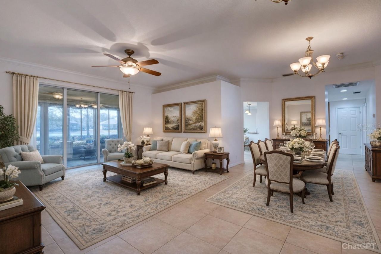 One or more photo(s) has been virtually staged. Welcome to a fabulous 2 bedroom plus a den/office, 2 bath Premium Golf Lot home in the desirable 55+ gated community of 'Arlington Ridge'. Step inside and you find an open layout that is great for a lifestyle of relaxing and entertaining with style. This is the best of Florida living and enjoys an easy flowing floor plan with Formal Dining, Living & Family Rooms, Eat-in Kitchen with an Island & Skylight, a Spacious primary suite with two walk-in closets and lanai access, well sized secondary bedroom and den spaces. Many added benefits await you such as SOLAR PANELS-PAID OFF, Roof 2015, HVAC 2019, House Water Softener, EXTENDED 2-car garage WITH SEPARATE GOLF CART BAY featuring retractable screens on both garage and golf cart doors, Gutters with leaf fitters, Pavers, SCREENED FRONT PATIO AND FULLY ENCLOSED REAR LANAI...Too many to list! HOA includes lawn care, cable & internet with Resort-style amenities including a championship golf course surrounded by a winding river and majestic oaks, a sparkling pool, modern fitness center, tennis courts, pickleball and more. Restaurant and bar & movie theater. Numerous clubs and social activities to fill your Calendar with fun! Conveniently located within a short drive to places like The Villages, nearby emergency care hospital, grocery stores, shops, dog park, plus plenty of restaurants, 10-15 minutes to the Florida Turnpike, 45 minutes to Disney World and major theme parks. Schedule a tour today! ** All information should be independently verified; room sizes are approx.**