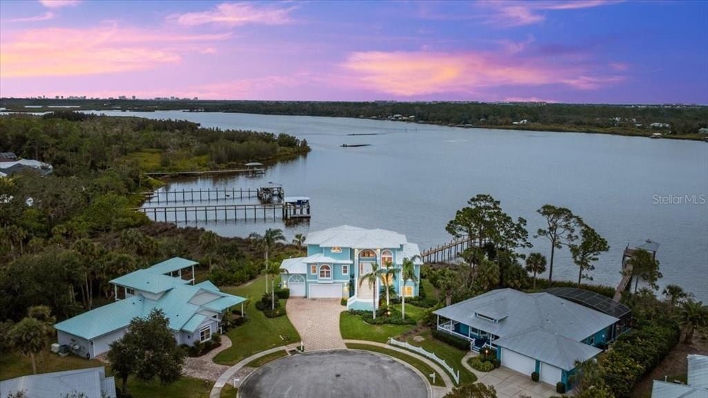 Luxury Waterfront Key West Style Home in Gated Osprey Cove! Discover a slice of paradise in this stunning waterfront Key West-style home nestled in the exclusive gated community of Osprey Cove in New Smyrna Beach. Located on the serene Turnbull Bay, this luxurious property offers a unique blend of elegance and coastal charm. The pavered concrete driveway and meticulous landscaping set the tone as you approach this exceptional home, crowned with a durable metal roof. Enter through the second floor to find the heart of the home, featuring a spacious living room, dining room, and a cozy two-sided fireplace. The chef's kitchen is a masterpiece, boasting a center island, ample cabinet and counter space, and breathtaking water views. Adjacent to the living spaces, an office offers the perfect spot for work or reflection, while two bedrooms, each with en-suite baths, and an additional half bath ensure effortless entertaining. The top floor is dedicated to the luxurious master suite, complete with a spa-like private bath, an expansive walk-in closet, and a private balcony where you can savor the tranquil waterfront vistas. Take the stairs or elevator to the ground floor, where you'll find a versatile family room, additional living space, an office, and a large screened patio. Step outside to your private dock that leads to the water's edge, complete with an outdoor fireplace perfect for relaxing evenings under the stars. The three-car garage ensures plenty of space for vehicles and storage. This home is a waterfront dream come true, offering luxurious living, unparalleled views, and a seamless connection to the natural beauty of Turnbull Bay. Don't miss the opportunity to make this extraordinary property your own! Square footage received from tax rolls. All information recorded in the MLS intended to be accurate but cannot be guaranteed.