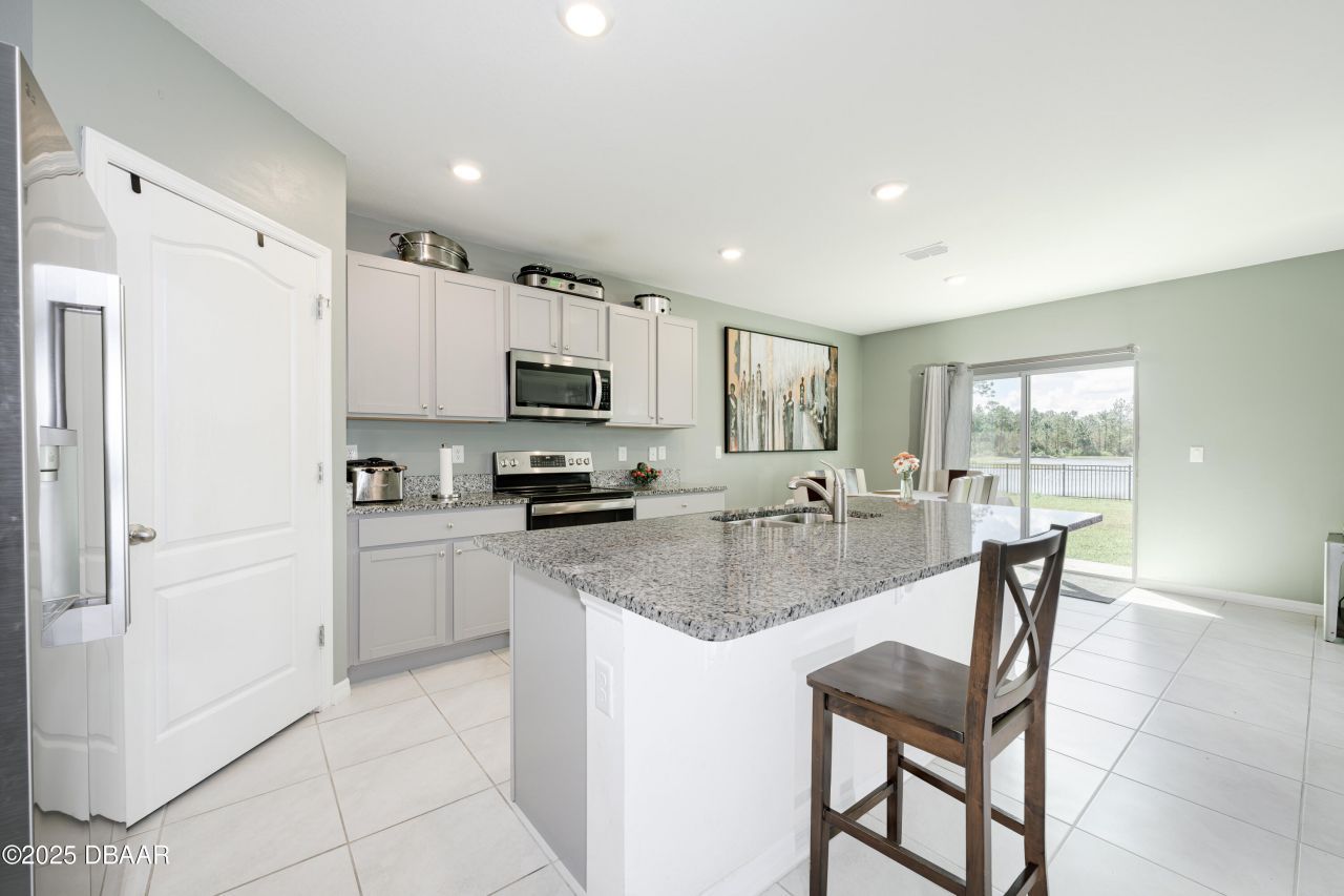 Assumable 4.125 FHA + Offering $5,000 for closing costs or rate buy down with acceptable offer. 5 BDR/3 LIVING ROOMS + on water!! Large fenced yard sits on a pond with fountain and has irrigation sprinklers, garden, and gazebo. Enjoy the wildlife on the water while sipping coffee on the patio. The open floor plan of this newer construction 5/3/2 offers a large center island kitchen with SS appliances, granite countertops, and a walk-in pantry. The main level also boasts a flex room, bedroom, bath and under the stairs storage. Upstairs you will find the spacious primary bedroom with his and her walk-in closets. There are 3 more bedrooms, another full bath, and another living area which could be enclosed for a 6th bedroom but currently is a playroom and movie room. If that's not enough the community offers plenty of playmates and a community pool. Square footage is received from Volusia County property appraiser records.