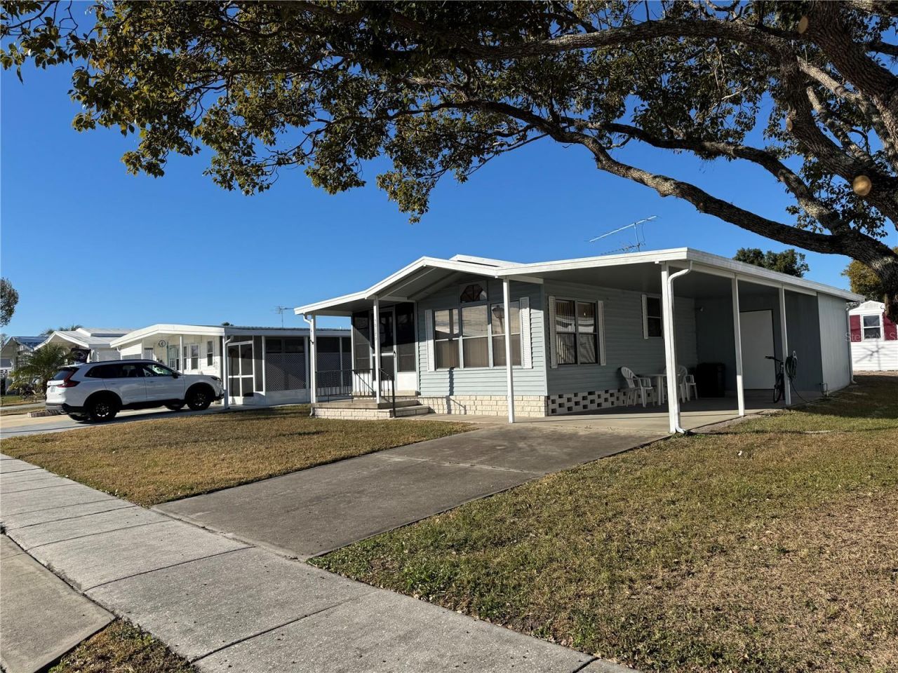 This inviting 1 bedroom, 1 bath home offers an open floor plan. The spacious kitchen, living room and dinette are designed for easy living. The built-in breakfront in the dining area offers attractive storage of everyday items. The spacious bedroom has built-in bureaus and closet. The ensuite bath has a tub with shower and a single vanity and plenty of linen storage. Enjoy the added Florida room, ideal for morning coffee or hosting guests. The shed includes laundry facilities with workshop space, providing great functionality and storage. A carport completes the property, making this a comfortable and practical place to call home. This home was constructed with grey water pipe system. American Condominium Park is a 55+ gated community with heated pool, clubhouse, exercise room, sauna, hot tub, tennis/pickleball courts, horse shoe pits, shuffleboard, and many more amenities. A friendly active community with dances, dinners, and entertainment. Perfect for full time affordable living and cost effective for snow birds. NO RENT AS YOU OWN THE LAND. Reasonable monthly fee of $130.00, that maintains the common elements and amenities for your use. Stop by and experience this fabulous community and home.