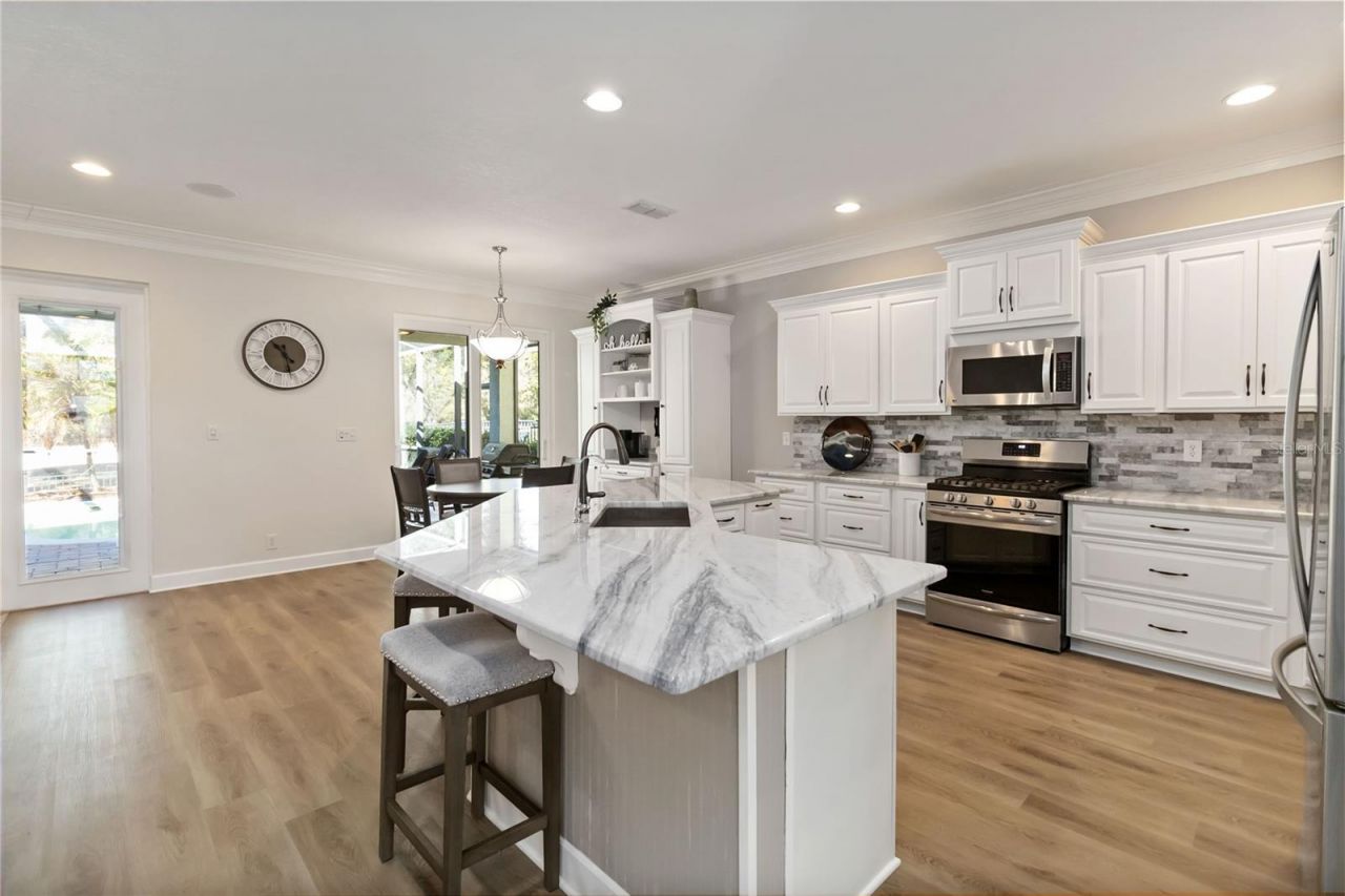 Location is everything, and this exceptional home delivers with stunning views of the 9th hole of the Victoria Hills Golf Course. Beautifully upgraded and meticulously maintained, this screened saltwater pool home offers a true move-in-ready opportunity for its next owner.The bright white kitchen has been thoughtfully updated with freshly painted all-wood cabinetry, elegant quartzite countertops, a natural gas stove, and a custom coffee bar. The open floor plan flows seamlessly into the great room, highlighted by oversized glass doors that frame the pool and golf course views beyond. Luxury vinyl plank flooring enhances the main living areas, with comfortable carpet in the bedrooms. Additional interior upgrades include fresh paint throughout, crown molding, and new curtains in the dining/den and guest bedrooms.The spacious primary suite features tray ceilings, while the en-suite bath offers a Jacuzzi tub, double vanity with granite countertops, and distinctive glass sink bowls.Major system updates provide peace of mind: Roof (12/2020) High-impact windows (2021) New A/C (2021) New gas water heater (2023)From the paver driveway and side-entry garage, you are welcomed into a bright foyer flanked by a dining room with coffered ceiling and a private office/den with French doors. The covered lanai features a custom ceiling and fans, creating the perfect shaded retreat for enjoying Florida's sunny days. Lush landscaping, a retaining wall, and black aluminum fencing complete the backyard setting.Located in the highly sought-after Victoria Park community, residents enjoy access to a clubhouse with restaurant and pro shop, an 18-hole championship golf course and driving range, three resort-style heated pools, two fitness centers, lighted tennis and pickleball courts, HD cable, high-speed internet, and reclaimed irrigation water.Just minutes from charming downtown DeLand, with its boutiques, dining, and cultural attractions, this home offers the perfect balance of luxury, lifestyle, and location.This is an exceptional opportunity to own a beautifully upgraded pool home with golf course views in one of the area's most desirable communities.