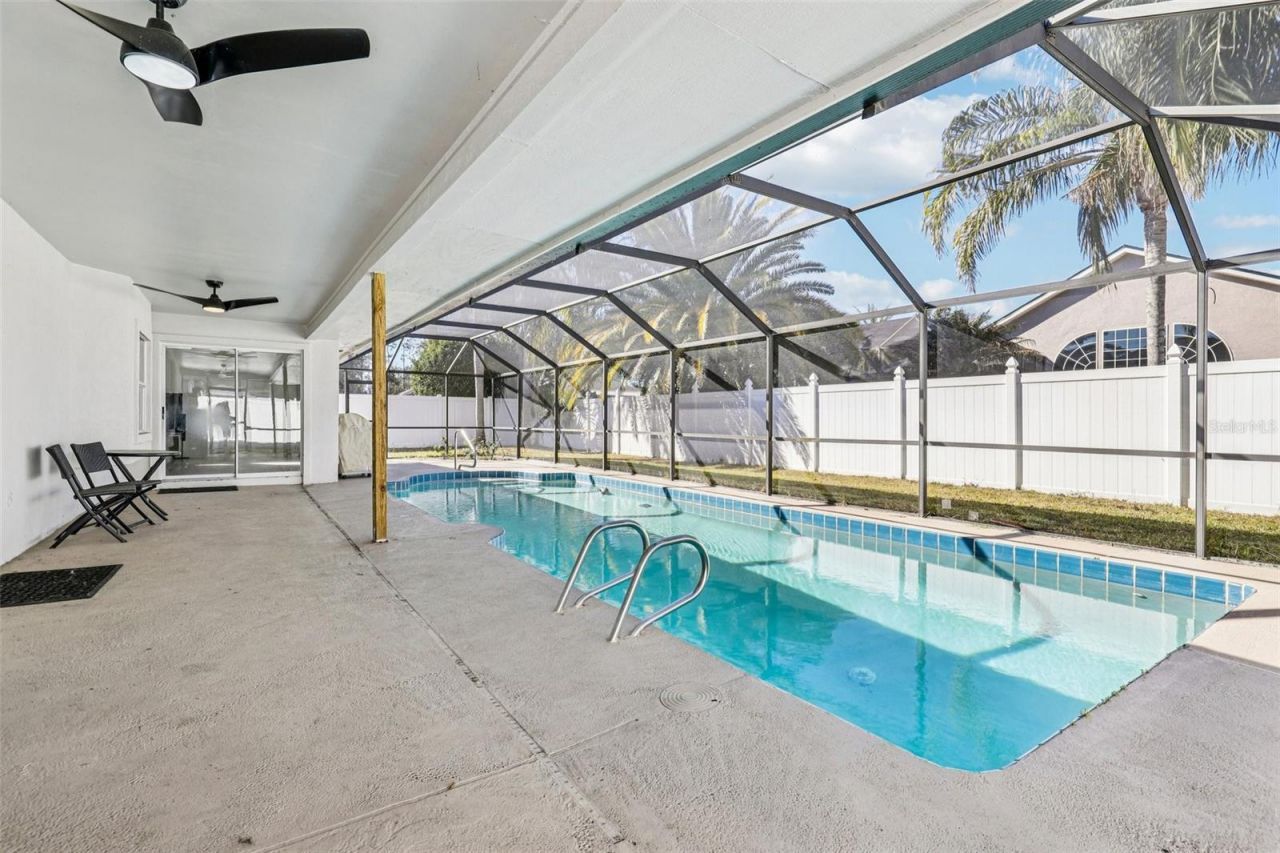 This move-in-ready 3-bedroom plus den home blends traditional charm with modern updates. The fresh, bright interior features a great room with vaulted ceilings that flows into a sunny dining area and a well-appointed kitchen, complete with a large island, granite countertops, stainless steel appliances, and warm oak cabinetry. French doors offer privacy for a dedicated office, while the primary suite serves as a retreat with high ceilings, direct pool access, and an en-suite featuring a soaking tub, double vanities, and a separate tiled shower. Two generous secondary bedrooms include walk-in closets and share an updated bathroom with a dual vanity. Practical highlights include a spacious indoor laundry room, a newer roof and water heater, and an oversized side-load garage with attic storage. Outside, the screened-in patio and sparkling pool overlook a fully fenced yard with mature palms and a decorative paver driveway. Excellent location, with easy access to shopping, dining, schools and a quick trip to the beach. Tour today! Roof late 2023, AC 2025 New internet garage opener 2026.
