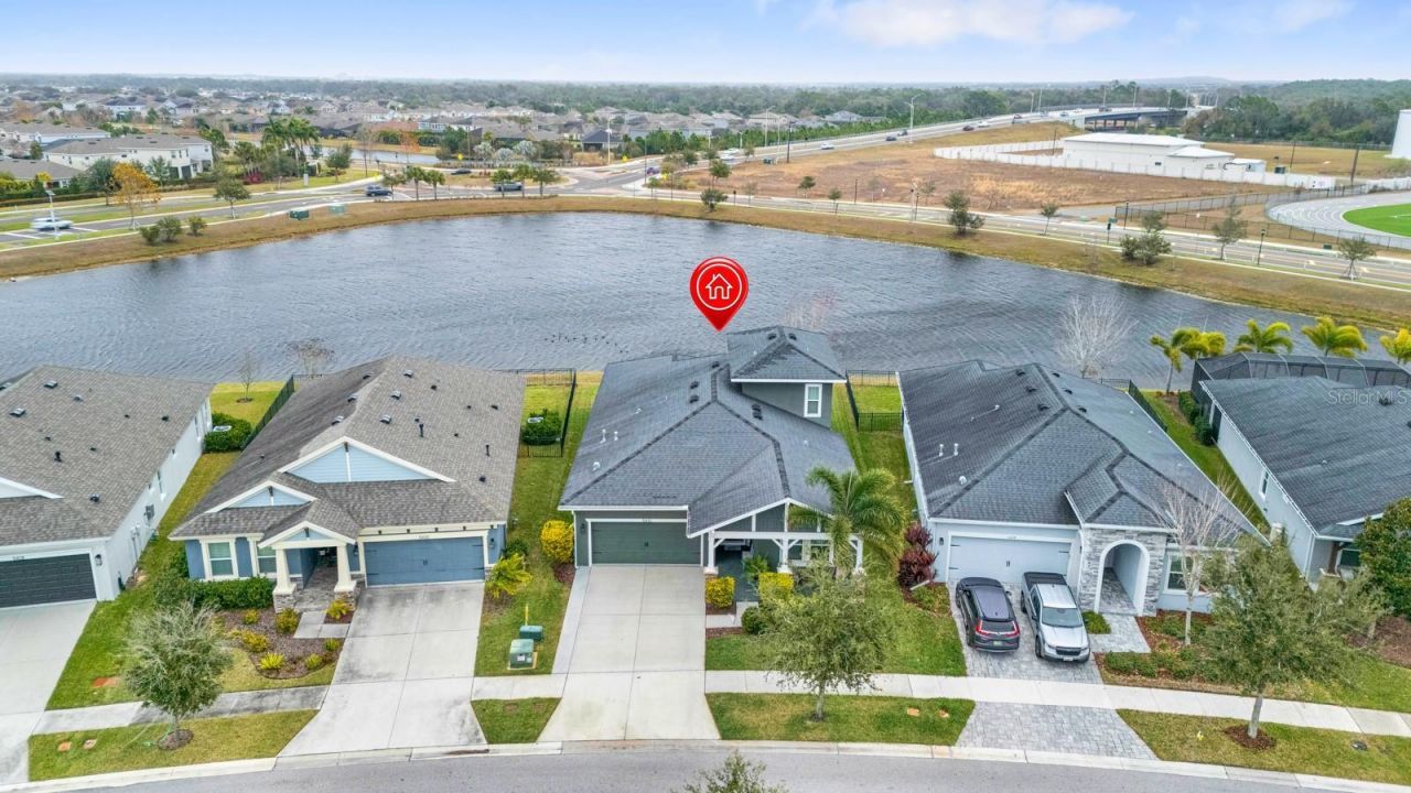Beautiful water views and no backyard neighbors create a serene backdrop for this well-appointed Cardel Northwood II offering 4 bedrooms, 3 full baths, and a spacious bonus room.A tray-ceiling foyer welcomes you with immediate pond views and designer finishes throughout, including wood-look plank ceramic tile, upgraded lighting and fans, added windows, and a custom built-in fireplace feature wall.The thoughtfully designed layout features two secondary bedrooms and a shared bath at the front of the home, along with a flex room behind French doors-ideal for a guest room, office, or study. An oversized laundry room with utility sink and custom cabinetry adds everyday convenience. Upstairs, a large room with full bath provides the perfect space for guests, a media room, or work-from-home needs.The upgraded kitchen showcases stainless steel appliances, including a Samsung smart refrigerator, built-in oven, 5-burner gas cooktop, quartz countertops, soft-close cabinetry, a walk-in pantry, and a large island overlooking the dining and great room. A 16' pocket slider opens to the screened lanai, seamlessly blending indoor and outdoor living while maximizing the peaceful pond views.The private owner's suite overlooks the water and features a spa-like bath with dual vanities, tiled walk-in shower, private water closet, and an oversized walk-in closet.Fresh interior and exterior paint, a whole-home water softener and filtration system, reverse osmosis, and an extended driveway complete the home. Residents enjoy access to Waterset's pools, clubhouse, fitness centers, trails, sports courts, dog parks, and more.