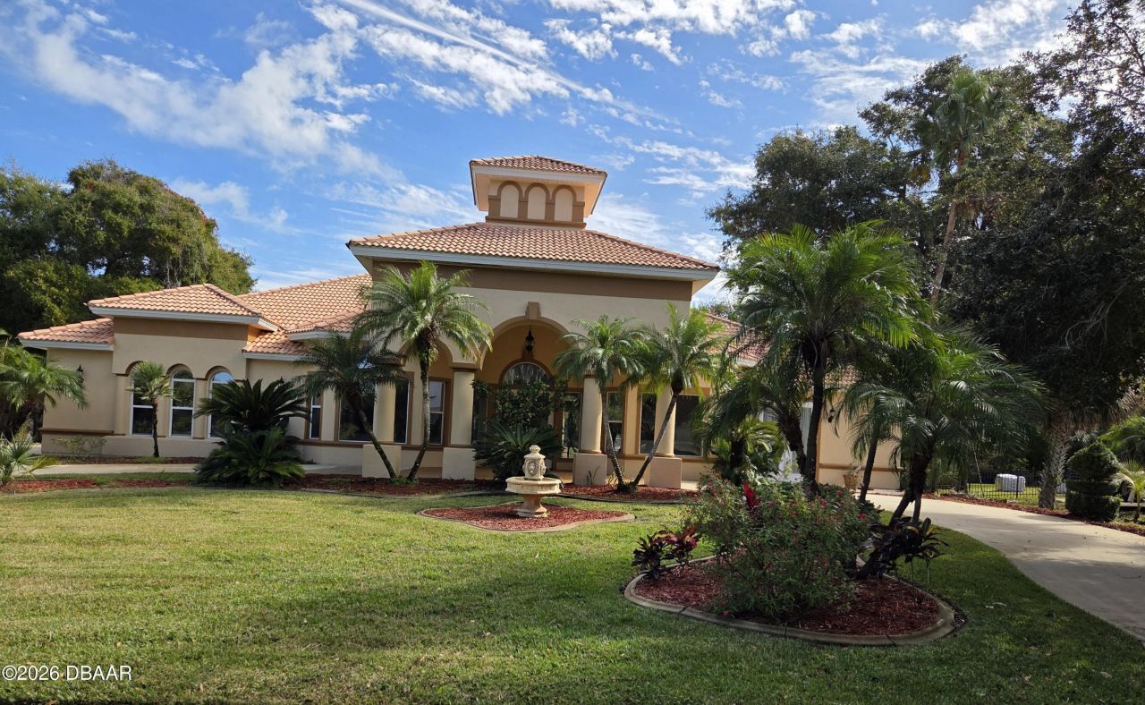 One or more photo(s) was virtually staged. Welcome to this Luxury, Custom-Built Mediterranean-style home. Step inside and prepare to be greeted by a grand foyer that leads into an impressive living room, an elegant formal dining room, and a dedicated piano room complete with a grand piano. The chef's kitchen is a culinary haven, appointed with a suite of professional-grade appliances, including integrated double wall ovens, a high-performance cooktop, microwave, dishwasher, trash compactor, and spacious walk-in pantry. At the center of this kitchen is a grand central island that offers ample prep space, complete with a sink. With a spacious breakfast area, it is ideal for setting up your coffee station to start your morning. An Entertainer's Dream Experience designed an entertainment room, featuring a dedicated home theater wall and a wet bar for serving guests in style. The expansive primary suite is a lavish retreat, featuring oversized dual walk-in closets for an organized wardrobe The primary bathroom offers a high-end, spa-like experience with a dual-head shower, a luxurious garden tub for soaking, and elegant dual vanities. A built-in makeup vanity and a private water closet with a bidet provide an added touch of luxury. This is a four-bedroom / 3.5-bathroom home with one of the bedrooms separated by the outside breezeway, which has its own bathroom. The office features custom shelving that serves as a safe room, adding an unexpected layer of security. Generously sized laundry rooms feature ample counter space for hobbies or crafts. The home is equipped with a central vacuum system and has been recently painted both inside and out, with the bedroom carpets having been replaced. New fans were replaced in the Lanai, one of the bedrooms, and the outdoor pool room. The pool controller, pump, and filter were replaced in 2024, along with the entire garage door and tracks. Enjoy year-round comfort and enhanced efficiency with multiple-zone HVAC systems and two water heaters, ensuring consistent temperature control and ample hot water throughout the home. This stunning home features a durable clay tile roof with a life expectancy of 50 years or more in Florida's climate. The community at Ormond Lakes offers an enjoyable resort-style living experience with community amenities that include a clubhouse, community pool, lighted tennis courts, fishing docks, walking paths, and a library located within the clubhouse.