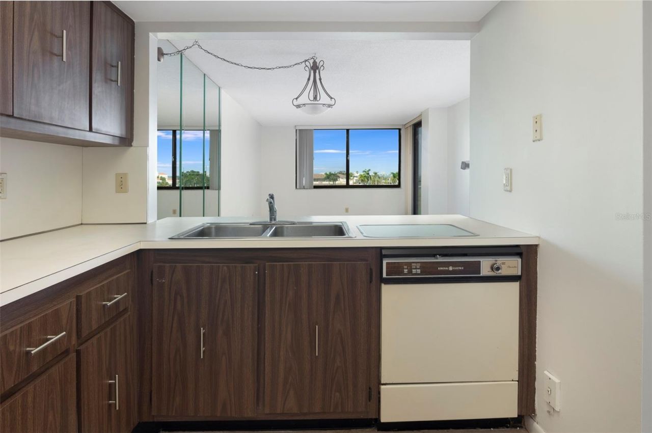 This move in ready and fully functioning 1 bed 1.5 bath condo with beautiful views over the Golf Course and peaks of Boca Ciega Bay is located in the resort style community of Palma del Mar in Isla del Sol. The seller pas paid the assessment in full. It is a wonderful locale, just a few minutes to the beach and Pass a Grille, which you could walk or bike to. This bargain priced property can work for an investor and an owner occupant alike. There's one designated parking spot just a few steps from the secured entrance and elevator, that takes you to the 4th. floor. You will find a clean kitchen with plenty of counter space and working appliances and you can always upgrade later. This property offers an open and livable floor plan from which you can take in the views from just about every angle. Have a coffee or wine or your private balcony and take in a stunning sunset. The spacious master suite includes a large walk in closet and an en suite bathroom. There's an additional guest bathroom and a laundry closet with washer and dryer. The pet friendly community offers a pool and spa, as well as bike and kayak storage. Golf memberships are available and renting is permitted. What an opportunity to relax in the sunshine!
