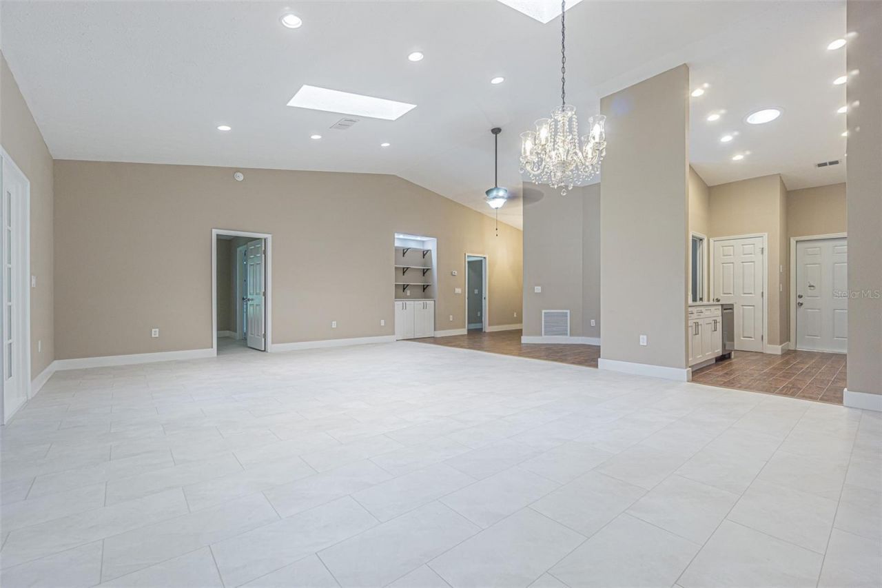 Brick, MAINTENANCE FREE, Beautifully remodeled VILLA nestled beneath Majestic oaks on a quiet cul-de-sac is READY for YOU! This move-in ready home has undergone a $60,000 interior renovation and offers a perfect blend of elegance, comfort, and functionality. Step through the screened front entry with non-slip tile flooring into a tiled foyer with coat closet and immediately notice the cathedral ceilings, natural light from skylights plus a solar tube... with the open layout enhanced by luxury vinyl plank flooring in both the great room and owner's suite. The stunning new kitchen is a chef's dream, featuring 42 soft-close white cabinets, quartz countertops, a quartz breakfast bar with pendant lighting, a glass tile backsplash with under-cabinet lighting and new stainless steel appliances including 2025 Refrigerator, Range, Dishwasher and Microwave-all complemented by a spacious closet pantry! The enormous great room OPENS into an enclosed Florida room with French doors, tile flooring, and plantation shutters... ideal FLEX SPACE for a home office, den, or additional living space. The owner's suite is a private retreat with a remodeled bathroom featuring dual vanities, a STUNNING tiled shower with accent bands and pebble floor and upgraded lighting and mirrors. The second bath has also been fully updated with quartz countertops and a new tub. Additional features include $12,000 in new windows for the front and side bedrooms, recessed and can lighting, upgraded decorative niches, custom paint, plant shelves with ceramic tile throughout the other areas. Enjoy the convenience of an interior laundry room equipped with a Maytag washer and dryer plus storage cabinets above. This home also includes a brand new AO Smith water heater. The 2-car garage features an epoxy floor finish, built-in cabinets and shelving, attic access with flooring for added storage, and a Genie automatic door opener. Outdoor living is easy with a screened back porch featuring an insulated roof and ceiling fan, plus an open rear patio with no side or rear neighbors-offering peace and privacy. The landscaped yard is complete with gutters and downspouts for easy maintenance. Low quarterly HOA and maintenance fees cover lawncare, lawn fertilization, weed killer and insect control, irrigation system maintenance and water is metered separately, making this home ideal for those seeking a low-maintenance lifestyle. Conveniently located near the East Pasco YMCA, local schools, daycare centers, Sarah Vandeburg Tennis center, medical facilities, shopping, restaurants with access to major highways for easy commute to Tampa, Orlando, Airports and the Beaches! This one truly has it all... location, upgrades, and comfort. CALL TODAY!