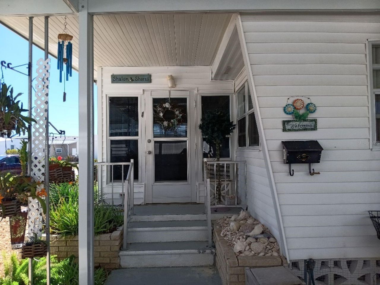 Very open and bright living space leading to a lovely 8x16 lanai across the front of this home. This room is set up to enjoy the view outside, having meals or snacks, enjoying tv, reading, etc. with windows across the entire front. What a great addition to this 2 bedroom, 1 1/2 bath home with a new roof in 2025, all paneled rooms changed to dry wall and insulated, A/C only 4 years old and front porch covered and protected from the elements. There are fans in all rooms and an unbelievably long (48 foot) carport to entertain friends and family protected from sun. Can put 3 cars underneath and still park another on the driveway. The shed houses the washer and dryer, has multiple storage as well as a work bench and more.Resort Style living! This beautiful community is located on Venice Island. Enjoy the heated pool with water aerobics and exercie classes. Country Club Estates has two clubhouses, both with kitchens. One clubhouse has a stage for bands and performances, the other overlooks the waterway, with rented boat slips for the residents. From the boat club to the book club, you will probably find it here. Pickleball, shuffleboard, corn hole, billiards, ping pong, library, fitness center, most card games, karaoke, events planned for the holiday, local bands and dj's for dances, neighborhood parades and scavenger hunts. Too many to list everything. Come and see for yourself.