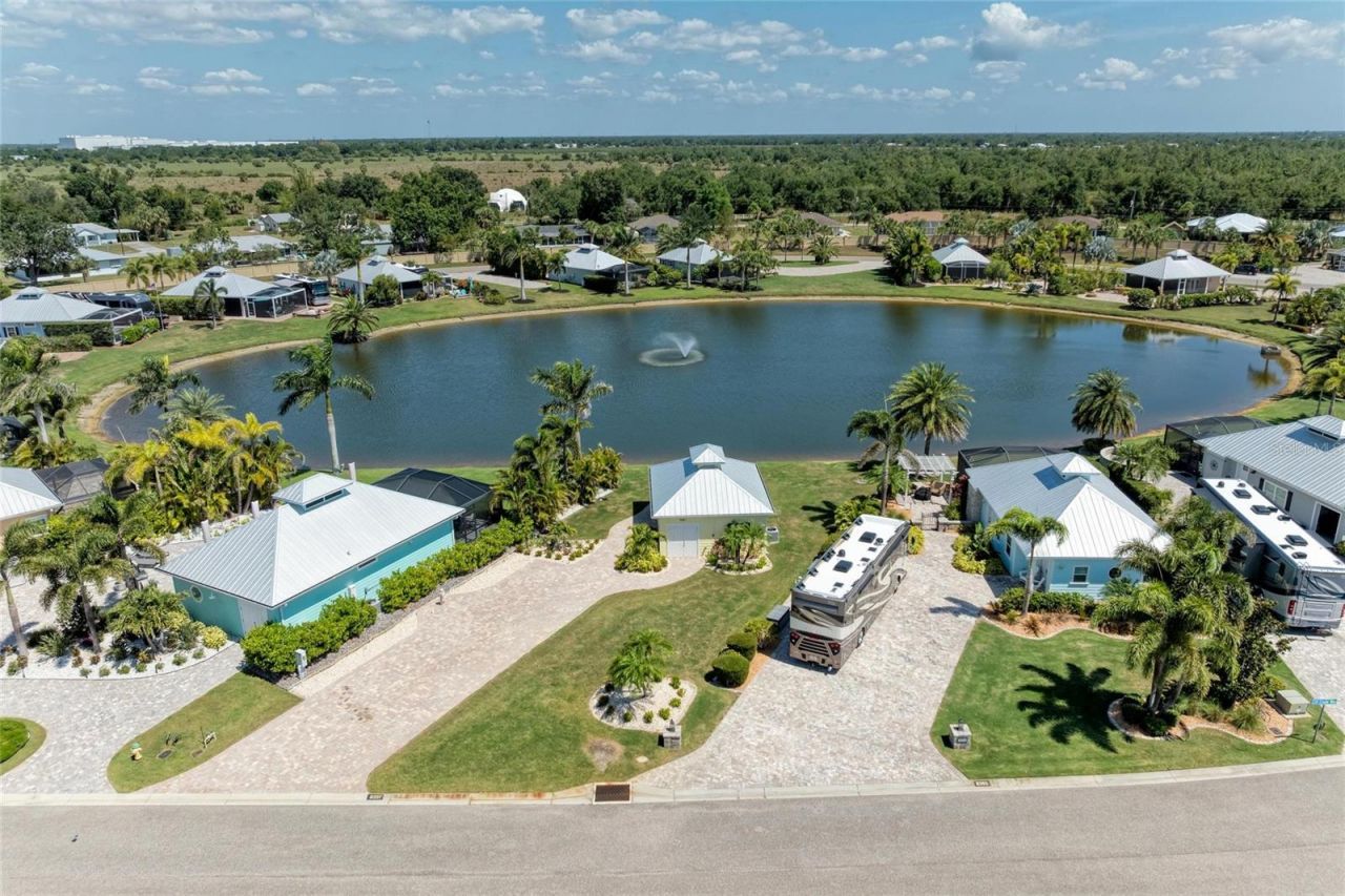 Lot 26 at Thornton Creek Motorcoach Resort offers a charming and well-designed Coach House that combines comfort, convenience, and scenic views. Arrive through a spacious RV pad perfectly suited for your Class A coach, and step into 350 square feet under roof that includes a cozy indoor area ideal for relaxing, watching TV, and enjoying the comfort of a full bathroom. The screened patio extends your living space outdoors and features a summer kitchen along with a seating area where you can unwind and take in the beautiful lake views. A dedicated garage space for your golf cart adds extra convenience. This property is ideally located just a short walk from the clubhouse, giving you easy access to the community pool and seasonal activities. Call today and schedule your private tour