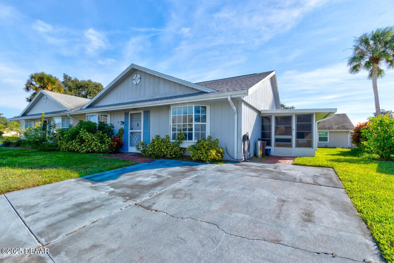 Welcome to 9 Par Drive in beautiful New Smyrna Beach, located in the desirable Hidden Lakes golf course community. This charming 2-bedroom, 2-bath half-duplex offers comfort, convenience, and modern updates throughout. Step inside to find updated vinyl plank flooring and a beautifully renovated kitchen featuring sleek white cabinetry, granite countertops, and stainless steel appliances. Enjoy peaceful mornings or relaxing evenings on the screened porch. Recent improvements include a new roof 2025 and a 2023 HVAC. The property also features two side-by-side driveway parking spaces and low HOA fees. Perfect as a full-time residence, vacation getaway, or investment opportunity, this home combines coastal living with the appeal of a golf course community, just minutes from beaches, shopping, dining, and all that New Smyrna has to offer.