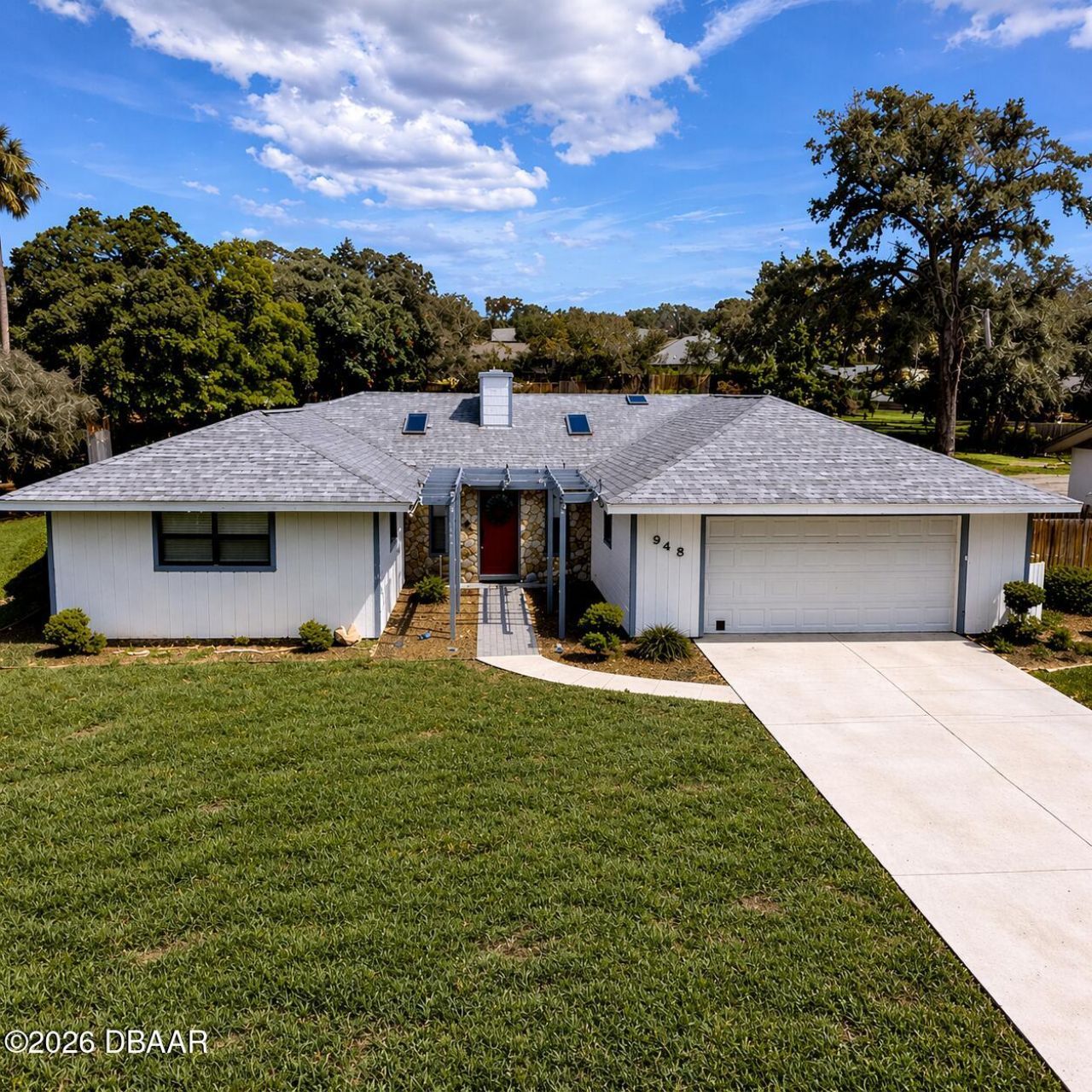 Rare opportunity to secure a lower interest rate with an assumable VA loan--something today's buyers don't want to miss. Qualified buyers can step into favorable terms, with lender approval required. For non-veteran buyers, refinancing within 5 years is necessary to restore the seller's VA entitlement.This beautifully maintained home offers over 1,600 sq ft of bright, inviting living space. Natural light pours in through skylights found in nearly every room--including the relaxing screened back porch!The open floor plan is perfect for entertaining, complimented by a formal dining area and tile/laminate flooring throughout. This home features a stunning sunken great room with vaulted ceilings, sliding doors leading to the backyard, and a striking rock wall fireplace that creates a cozy focal point with character and charm.Set far back from the road on a large lot, this property features a long driveway, a workman's garage with additional storage, and a truly private backyard.