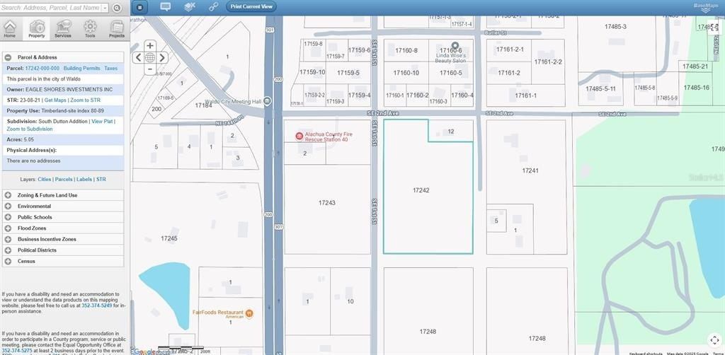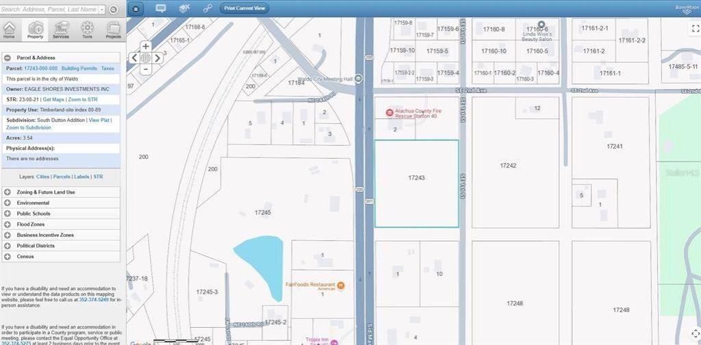 PRICED TO SELL at just over $10,000.00 per acre, this 19.16 acre (3.54 acre city center commercial zoning + 15.62 medium density residential) commercially zoned assemblage of land in the heart of Waldo FL is located just off HWY 301 with an AADT of nearly 16,000. This property is perfect for ground-up multifamily or commercial uses and boasts over 400 linear feet of frontage on HWY 301. Per tax records, all 19.16 acres are completely dry and fairly flat, presenting minimal barriers to entry. Sale includes Parcel #'s 17242-000-000, 17243-000-000, and 17248-000-000.