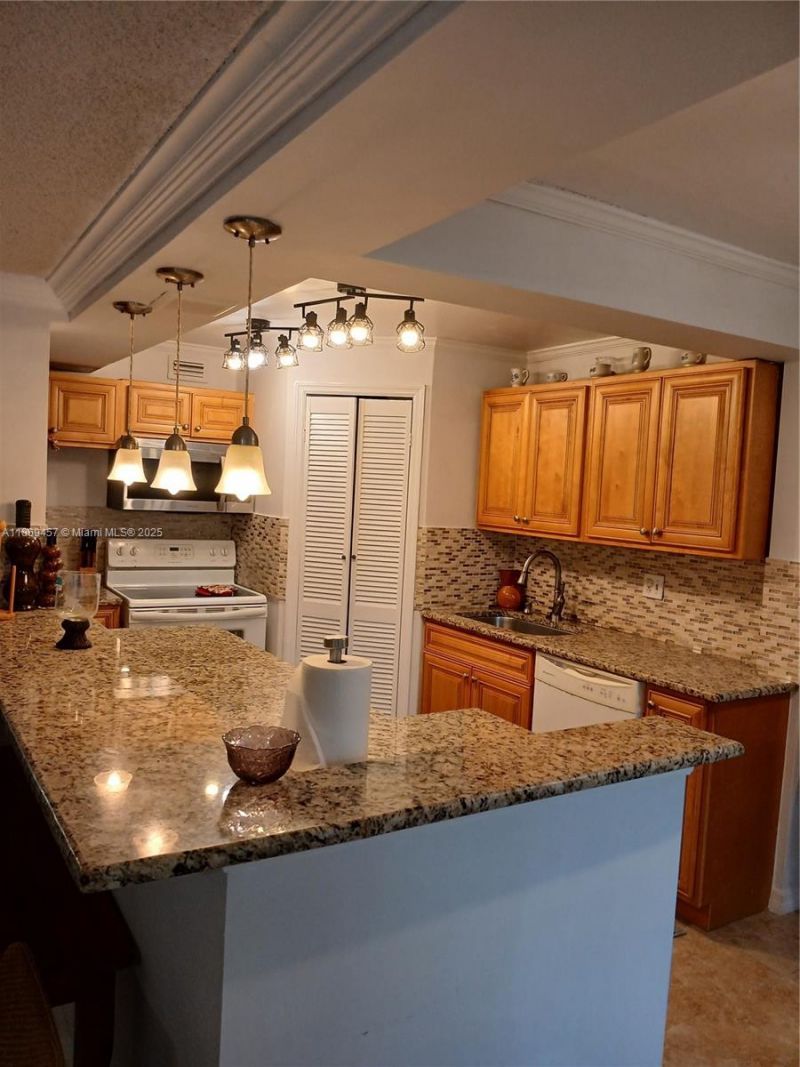 Step into this beautifully upgraded corner unit featuring enhanced ceramic tile flooring throughout the living areas and both bedrooms. The sunken living room flows seamlessly into an open-concept layout, accented by detailed crown molding and professionally painted walls for an elegant touch.The updated kitchen boasts gorgeous granite countertops, a neutral tiled backsplash, and a full suite of appliances. Both bedrooms feature spacious walk-in closets and an additional oversized pantry closet with washer/dryer offers exceptional storage. Enjoy a perfectly maintained AC and water heaterLocated in a secure gated community, residents enjoy premium amenities including indoor and outdoor pools, spa, five tennis courts, gym, saunas, putting range, racquet courts, and a BBQ area.
